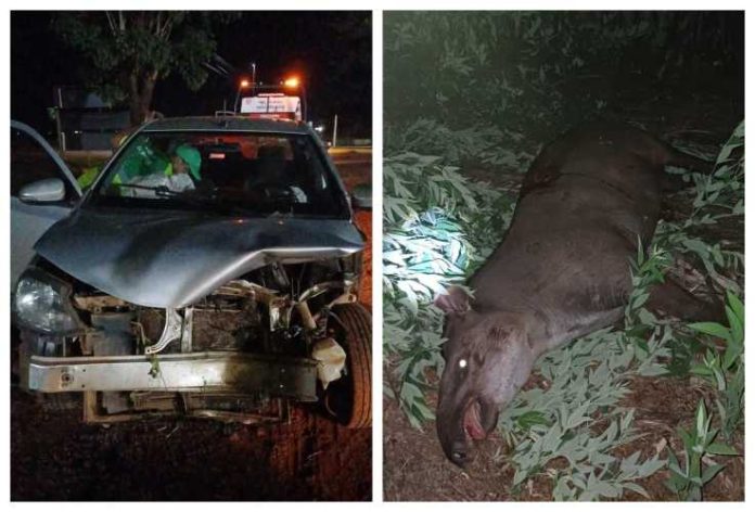 Acidente foi registrado na noite de sábado (25) nas proximidades do Distrito de Progresso, em Tangará da Serra, após uma anta atravessar a pista e ser atingida por um veículo que trafegava pela via.