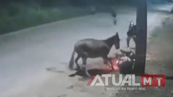 Um motociclista viveu momentos de tensão na madrugada de segunda-feira (26), após sofrer um acidente provocado por um cavalo solto na avenida Manoel Ribeiro, em Imperatriz, município localizado a cerca de 635 quilômetros de São Luís/MA. Logo após a queda, o homem acabou sendo alvo de um assalto cometido por três criminosos. Imagens de uma câmera de segurança registraram o momento em que o animal atravessa a pista e atinge o motociclista, que cai da moto. Em seguida, o cavalo foge do local.