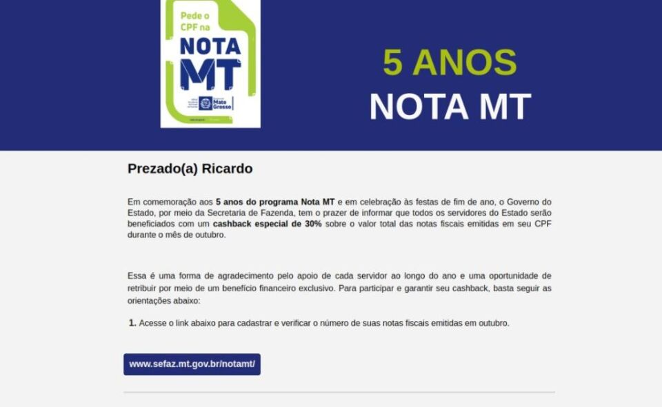 Conforme a mensagem enviada pelos estelionatários, uma ação em comemoração aos cinco anos do Nota MT concederia um cashback especial de 30% sobre o valor total das notas fiscais emitidas durante o mês de outubro.