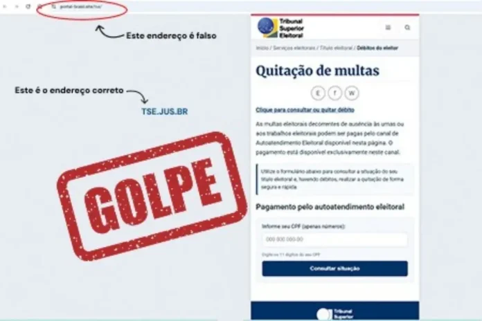 Os supostos comunicados afirmam a existência de “pendências eleitorais” e solicitam o acesso a links externos para “regularização imediata”. Ao clicar, o usuário é direcionado a uma página falsa, com logomarca do TSE semelhante à da Justiça Eleitoral, o que pode induzir a pessoa a acreditar que está em um site oficial.