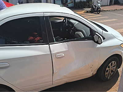 O condutor da moto não conseguiu frear a tempo e colidiu contra a lateral do carro, modelo Prisma, sendo lançado ao solo.