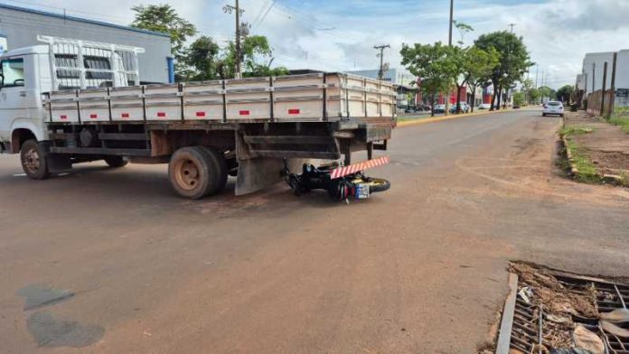 Acidente de trânsito registrado na Avenida Ismael José do Nascimento, esquina com a Rua 32, que dá acesso ao Jardim Califórnia, em Tangará da Serra, envolvendo um caminhão e uma motocicleta.