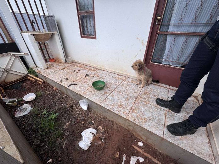 Ao chegar no local, as autoridades encontraram um cachorro em situação deplorável. Ele estava com ferimentos pelo corpo, rodeado de urina e fezes, sem alimentação e água. Vizinhos que estavam alimentando o animal na ausência da tutora.