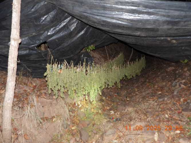 As equipes encontraram uma estrutura complexa de irrigação, composta por motor, caixas d’água e bomba de sucção, além de centenas de pés de maconha em processo de secagem sob lona preta. A operação também constatou significativa devastação ambiental, com corte de árvores e demarcação de cercas para a instalação da plantação ilegal. Nos barracos erguidos na área, foram recolhidos objetos que reforçam a ligação direta com a atividade criminosa.