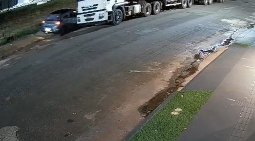 As imagens mostram o carro iniciando o deslocamento de forma desgovernada, descendo a rua e atingindo inicialmente uma lixeira que estava na calçada. Na sequência, o veículo seguiu em movimento até colidir contra uma carreta que se encontrava estacionada.