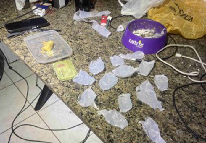 Diante da situação, a equipe realizou a entrada no local. Durante as buscas, foi encontrada sob uma mesa uma tampa plástica contendo uma pedra de pasta base de cocaína e diversas porções menores da mesma substância, que estavam esfareladas, dificultando a quantificação. No interior da kitnet também foi localizada uma porção de substância análoga à maconha, armazenada em uma embalagem plástica do tipo zip lock.