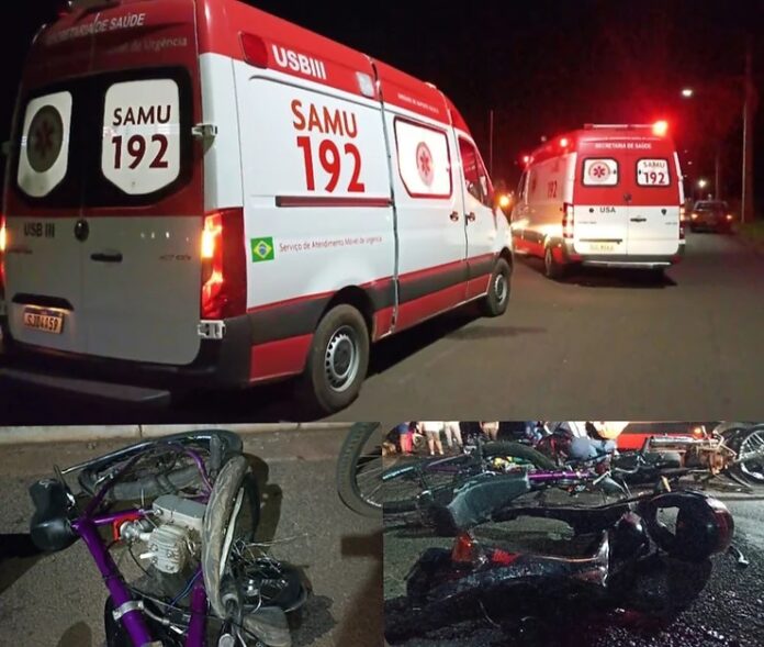 Um grave acidente aconteceu envolvendo uma moto pop e uma bicicleta adaptada com motor, segundo informação apurada pelo site Plantão TGA no local.