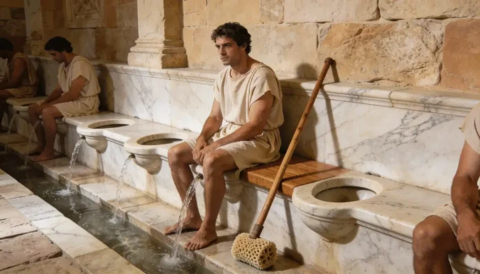 Os romanos eram mestres em engenharia sanitária e tinham banheiros públicos sofisticados com bancos de mármore e sistema de esgoto. Para a higiene pessoal, eles usavam uma esponja marinha presa na ponta de um bastão de madeira, conhecida como tersorium. Essa esponja era mergulhada em um canal com água corrente ou vinagre que ficava na frente dos assentos sanitários.