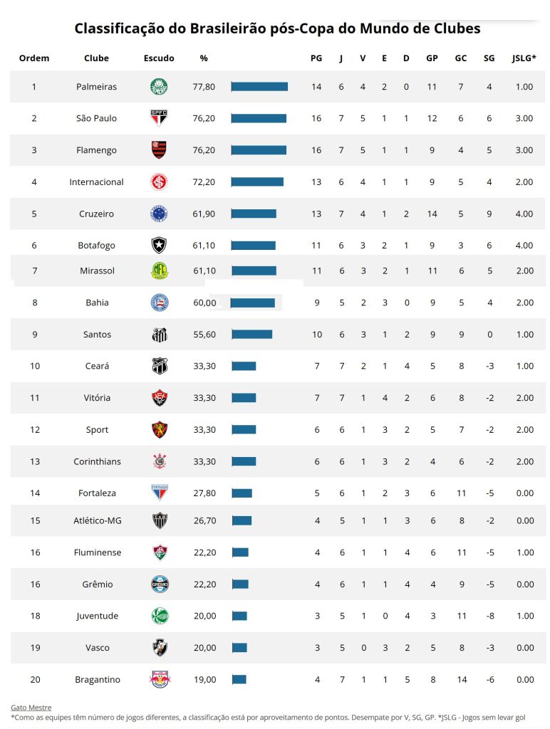 Confira abaixo como está a classificação quando considerados apenas os jogos a partir da 13ª rodada. A tabela é dinâmica. É possível reorganizar os times clicando no alto de cada coluna. Ao clicar em pontos ganhos (PG), o Flamengo aparece antes do São Paulo, mas nos critérios de desempate do campeonato tem melhor campanha no período. Veja abaixo.