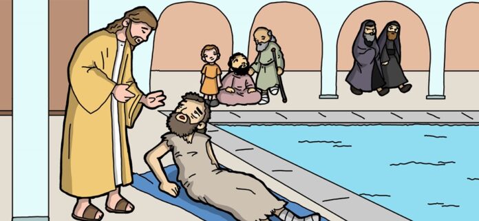 Depois disso, houve uma festa dos judeus, e Jesus subiu a Jerusalém. Ora, existe em Jerusalém, perto da Porta das Ovelhas, uma piscina com cinco pórticos, chamada Bezata em hebraico. Muitos doentes, cegos, coxos e paralíticos ficavam ali deitados Encontrava-se ali um homem enfermo havia trinta e oito anos. Jesus o viu ali deitado e, sabendo que estava assim desde muito tempo, perguntou-lhe: «Queres ficar curado?» O enfermo respondeu: «Senhor, não tenho ninguém que me leve à piscina, quando a água se movimenta. Quando estou chegando, outro entra na minha frente». Jesus lhe disse: «Levanta-te, pega a tua maca e anda». No mesmo instante, o homem ficou curado, pegou sua maca e começou a andar. Aquele dia, porém, era um sábado. Por isso, os judeus disseram ao homem que tinha sido curado: «É sábado. Não te é permitido carregar a tua maca”. Ele respondeu: “Aquele que me curou disse: ‘Pega tua maca e anda!’» Então lhe perguntaram: «Quem é que te disse: ‘Pega a tua maca e anda’?» O homem que tinha sido curado não sabia quem era, pois Jesus se afastara da multidão que se tinha ajuntado ali. Mais tarde, Jesus encontrou o homem no templo e lhe disse: «Olha, estás curado. Não peques mais, para que não te aconteça coisa pior». O homem saiu e contou aos judeus que tinha sido Jesus quem o havia curado. Por isso, os judeus começaram a perseguir Jesus, porque fazia tais coisas em dia de sábado.