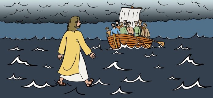 Ao anoitecer, os discípulos desceram para a beira-mar. Entraram no barco e foram na direção de Cafarnaum, do outro lado do mar. Já estava escuro, e Jesus ainda não tinha vindo a eles. Soprava um vento forte, e o mar estava agitado. Os discípulos tinham remado uns cinco quilômetros, quando avistaram Jesus andando sobre as águas e aproximando-se do barco. E ficaram com medo. Jesus, porém, lhes disse: «Sou eu. Não tenhais medo!». Eles queriam receber Jesus no barco, mas logo o barco atingiu a terra para onde estavam indo.