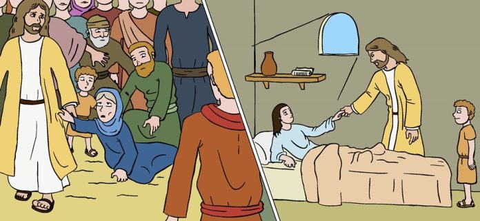 Hoje, vamos com Jesus a casa de Jairo, onde a sua filha está muito doente, em perigo de morte. Pelo caminho acontece algo extraordinário… A mulher que sofria um fluxo de sangue! A sua grande fé e confiança no Salvador ajudou-a a superar os obstáculos… – Superando a vergonha e o medo, abriu caminho através da multidão até “tocar” Jesus. «E a partir daquele momento a mulher ficou curada».