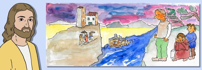 Naquele tempo, Jesus disse aos discípulos: «Nem todo aquele que me diz: ‘Senhor! Senhor!’, entrará no Reino dos Céus, mas só aquele que põe em prática a vontade de meu Pai que está nos céus. Portanto, quem ouve estas minhas palavras e as põe em prática é como um homem sensato, que construiu sua casa sobre a rocha. Caiu a chuva, vieram as enchentes, os ventos deram contra a casa, mas a casa não desabou, porque estava construída sobre a rocha. Por outro lado, quem ouve estas minhas palavras e não as põe em prática é como um homem sem juízo, que construiu sua casa sobre a areia. Caiu a chuva, vieram as enchentes, os ventos sopraram e deram contra a casa, e ela desabou, e grande foi a sua ruína!».