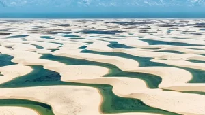 Na estação chuvosa, entre maio e setembro, as dunas de areia branca se transformam em um mosaico de lagoas de água cristalina. O contraste entre o branco da areia e o tom esmeralda da água cria uma paisagem quase surreal, onde é possível nadar em meio às dunas. Segundo a National Geographic, o fenômeno é um dos mais singulares do mundo.