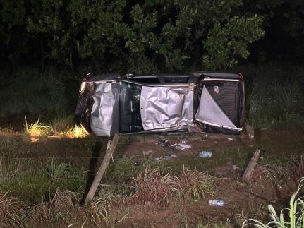 Com o impacto da colisão e a tentativa de frear, o carro capotou. A moto foi atingida e os dois veículos foram para fora da rodovia. Chovia bastante no momento do acidente.