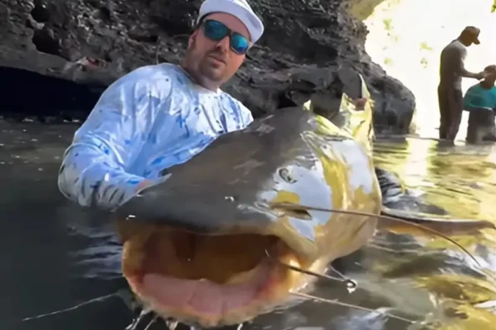 Imagens mostram turista na Caverna, após capturar jaú, um dos maiores que habitam os rios de água doce no Brasil