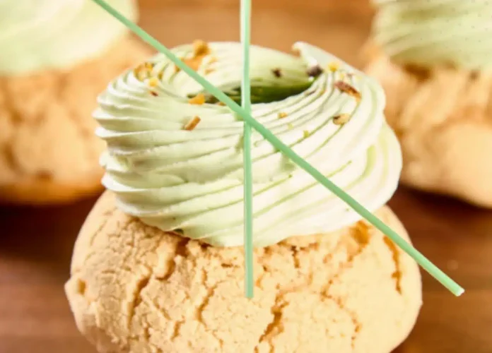 • Com a choux assada, faça furos na base e aplique o creme seda de pistache.