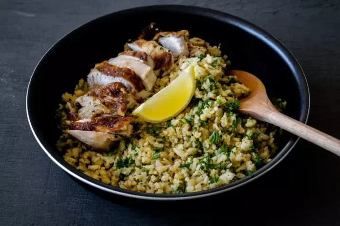 Em uma panela, aqueça um fio de azeite e refogue o alho. Acrescente a couve-flor triturada, o sal e a pimenta-do-reino. Cozinhe por cerca de 5 minutos, mexendo sempre, até que a couve-flor fique macia, mas ainda soltinha. Finalize com a salsinha e misture bem. Sirva o arroz de couve-flor em um prato ou tigela, disponha as fatias de frango grelhado por cima e finalize com a fatia de limão-siciliano. Sirva em seguida.