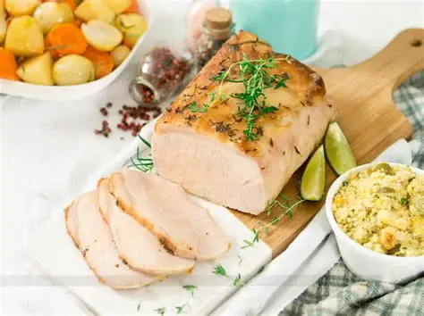 Preaqueça o forno a 200 °C. Em seguida, em uma assadeira, coloque o lombo e regue com o vinho branco. Cubra com papel-alumínio e asse por 1 hora. Retire o papel, adicione as batatas, a abobrinha, a cebola e o tomate ao redor da carne. Volte ao forno por mais 40 minutos, regando ocasionalmente com o próprio caldo, até dourar bem por fora e os legumes ficarem macios. Retire do forno, retire os barbantes e salpique o alecrim. Espere 10 minutos antes de fatiar e sirva o lombo acompanhado dos legumes assados.