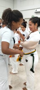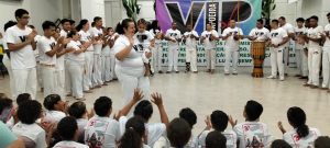A Graduada Brisa, anfitriã do evento, expressou sua felicidade em ver o auditório lotado e fez um convite especial ao público feminino: “Eu tenho certeza que a capoeira é um instrumento para a autoestima da mulher, então eu acho que toda mulher devia jogar capoeira”. Ela reforçou o esforço coletivo para realizar o batizado, lembrando que “a gente luta todos os dias e se deslocar até aqui para viver em prol da capoeira não é fácil”.