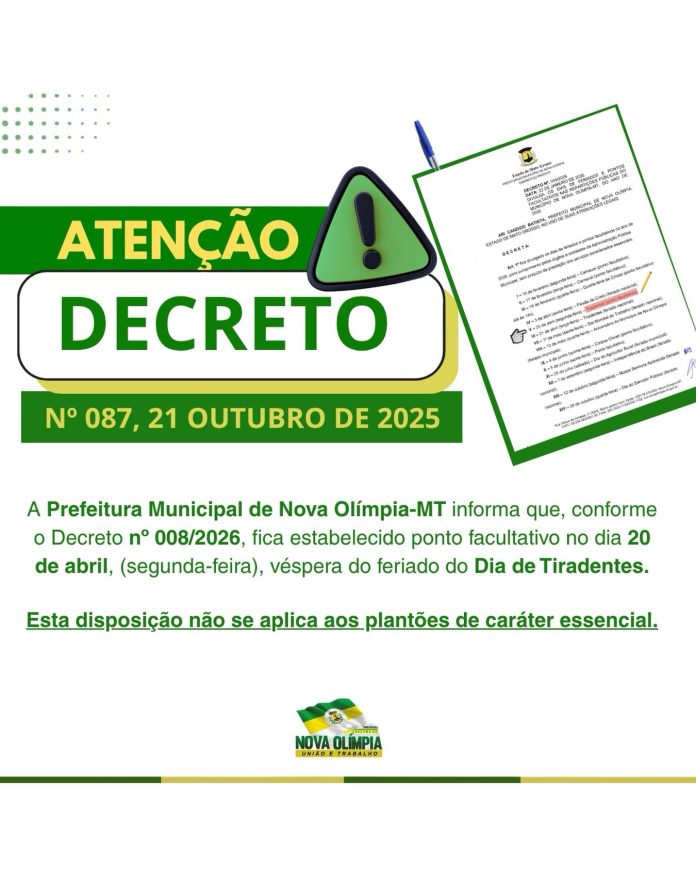 A Prefeitura Municipal de Nova Olímpia-MT informa que, conforme o Decreto nº 008/2026, foi estabelecido ponto facultativo no dia 20 de abril (segunda-feira), véspera do feriado do Dia de Tiradentes.