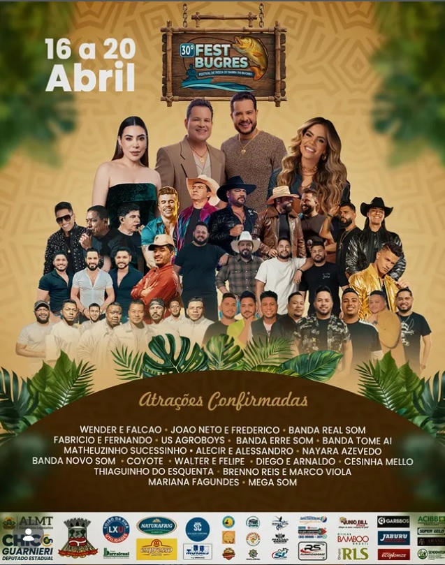 Além dos shows nacionais, o evento é o palco da cultura e do talento local através dos tradicionais festivais de pesca e música. O 30º FestBugres reafirma a vocação turística e sustentável da cidade, atraindo pescadores de toda a região para as águas do Rio Paraguai.