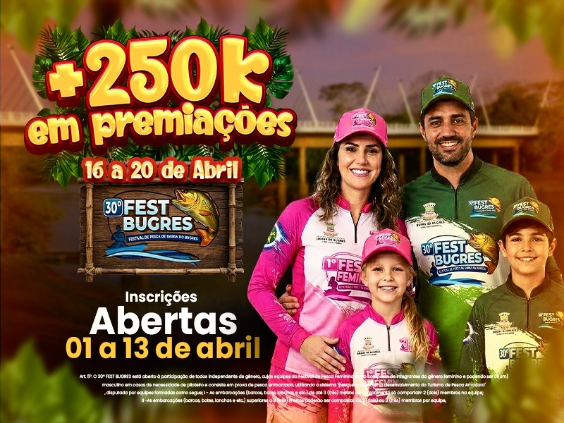 Para atrair pescadores de todo o Estado e de outras regiões do país, a prefeitura anunciou uma das maiores premiações da história dos festivais de pesca de Mato Grosso. Serão dois carros 0km como prêmios principais, além de motores, barcos e valores em dinheiro.