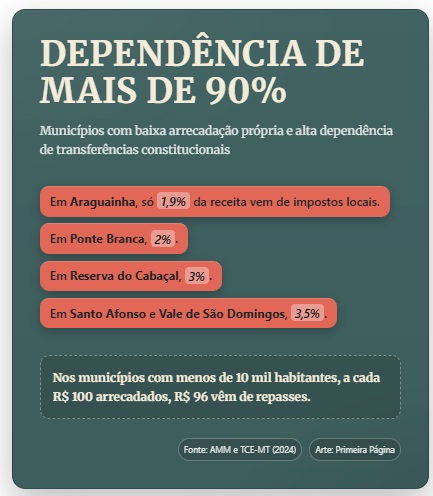 Um levantamento feito a pedido do Primeira Página pela Associação Mato-grossense dos Municípios (AMM), com base em dados do Radar Receita do Tribunal de Contas de Mato Grosso (TCE-MT), mostra que a dependência de repasses é a regra entre os pequenos municípios.
