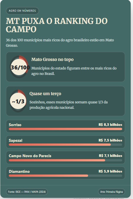 Com base na pesquisa anual do IBGE sobre Produção Agrícola Municipal, o estudo revela que 36 dos 100 municípios mais ricos do campo estão em território mato-grossense. Juntos, esses municípios somam quase um terço de toda a riqueza agrícola do país.