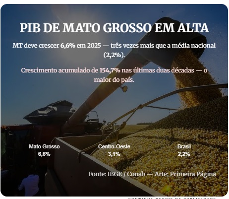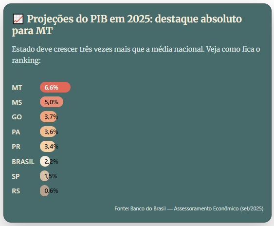 Além disso, Mato Grosso deve liderar o crescimento econômico do Brasil em 2025, com uma projeção de alta de 6,6% no Produto Interno Bruto (PIB), desempenho três vezes superior à média nacional, estimada em 2,2%, segundo o mais recente boletim de Assessoramento Econômico do Banco do Brasil.