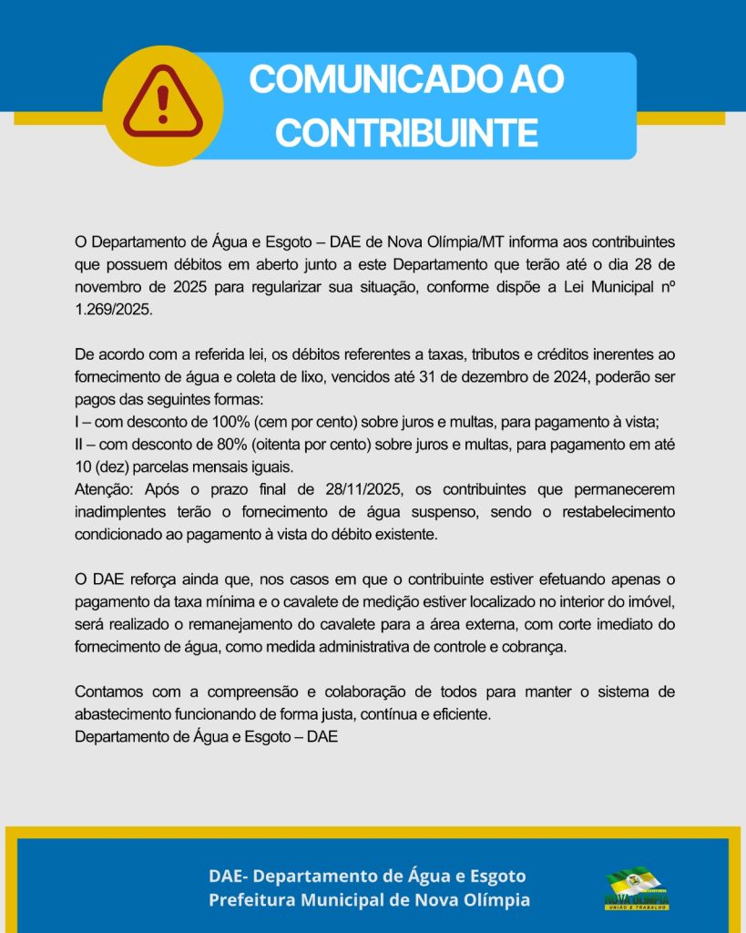 O Departamento de Água e Esgoto (DAE) de Nova Olímpia/MT anunciou uma oportunidade crucial para os contribuintes regularizarem seus débitos pendentes junto ao Departamento. De acordo com a Lei Municipal nº 1.269/2025, os devedores terão até o dia 28 de novembro de 2025 para acertar suas contas com condições especiais.