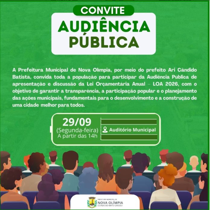 A Prefeitura Municipal de Nova Olímpia, por meio do prefeito Ari Cândido Batista, convida toda a população para a Audiência Pública de apresentação e discussão da Lei Orçamentária Anual – LOA 2026.