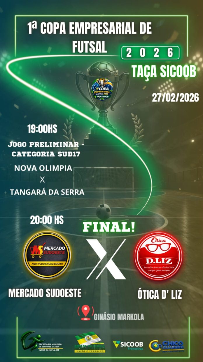 O Ginásio Markola será o palco de todas as emoções na noite desta sexta-feira, 27 de fevereiro. Após semanas de confrontos intensos, a 1ª Copa Empresarial de Futsal – Taça Sicoob 2026 chega ao seu momento ápice. As duas melhores equipes da competição, Mercado Sudoeste e Ótica D’ Liz, entram em quadra às 20h00 para decidir quem levará o troféu de campeão para casa.
