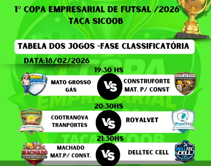 A bola volta a rolar na noite desta quarta-feira (18) pela fase classificatória da 1ª Copa Empresarial de Futsal 2026 – Taça Sicoob. O evento, organizado pela Secretaria Municipal de Esporte e Lazer, tem atraído um excelente público ao Ginásio Markolla, consolidando-se como um dos principais pontos de encontro dos desportistas de Nova Olímpia neste início de ano.