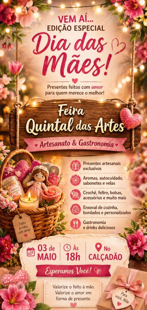 No próximo dia 3 de maio, o evento realiza uma edição especial pensada inteiramente para o Dia das Mães, sob a cuidadosa coordenação de Djackleinne Sheronn e um coletivo de talentosas colaboradoras locais. O diferencial desta edição reside na proposta de um consumo mais consciente e humano, onde o “feito à mão” ganha o protagonismo que merece. (veja abaixo da matéria as logos)