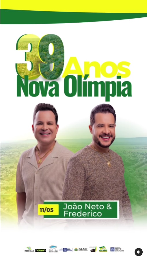 No domingo, dia 11, às 20h30, o Centro de Eventos vai vibrar com os ritmos sertanejos de João Neto e Frederico, em uma comemoração especial pelos 39 anos de emancipação político-administrativa de Nova Olímpia!