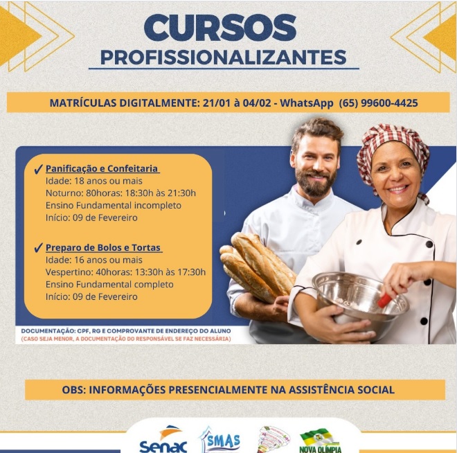 A Prefeitura Municipal de Nova Olímpia, por meio das Secretarias de Assistência Social e Educação, anunciou a abertura de novas oportunidades de qualificação profissional para a população. Em uma parceria estratégica com o SENAC, serão ofertados cursos gratuitos nas áreas de panificação e confeitaria, visando fomentar a geração de renda e o empreendedorismo local.