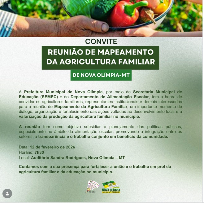 A Prefeitura Municipal de Nova Olímpia, por meio da Secretaria Municipal de Educação e do Departamento de Alimentação Escolar, anunciou a realização da Reunião de Mapeamento da Agricultura Familiar. O evento, que acontecerá no dia 12 de fevereiro, busca reunir produtores locais e a comunidade para fortalecer a economia rural e a merenda escolar do município.