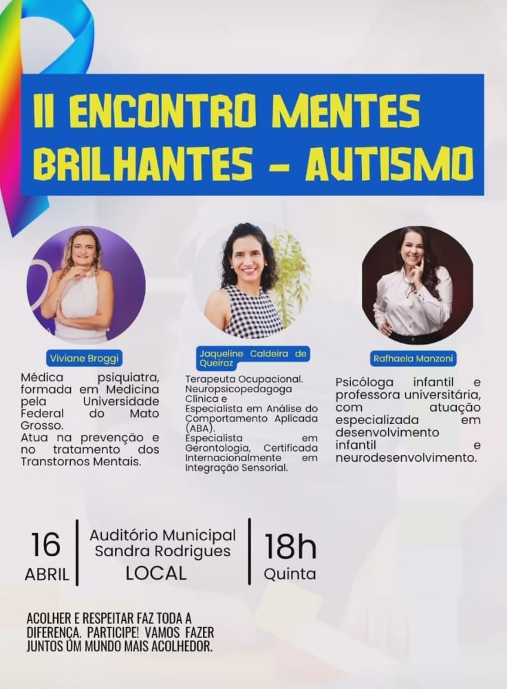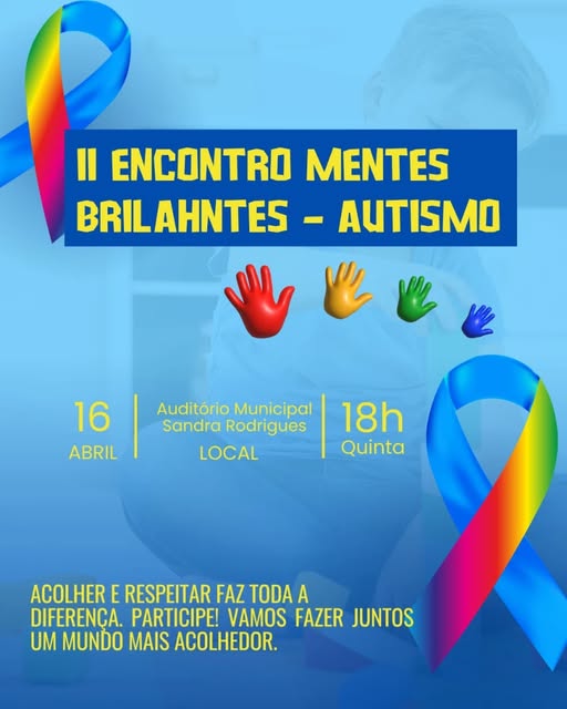 A Prefeitura de Nova Olímpia por meio da Secretaria de Saúde, realiza nesta quinta-feira, dia 16 de abril, a segunda edição do “Encontro Mentes Brilhantes”, um evento dedicado a discutir o Transtorno do Espectro Autista (TEA) sob diferentes perspectivas profissionais. O encontro acontece no Auditório Municipal Sandra Rodrigues, a partir das 18h, e busca reunir famílias, profissionais da educação e saúde, além de toda a comunidade interessada em promover um ambiente mais acolhedor e inclusivo.