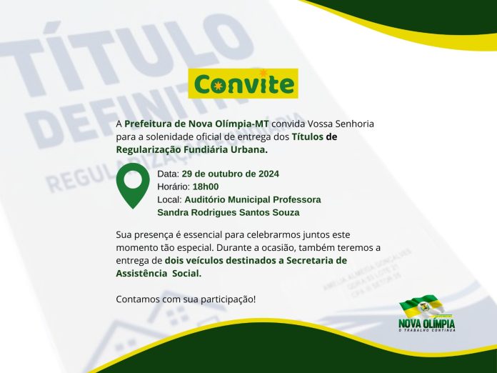 A Prefeitura de Nova Olímpia-MT convida Vossa Senhoria para a solenidade oficial de entrega dos Títulos de Regularização Fundiária Urbana.