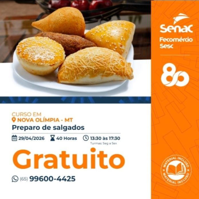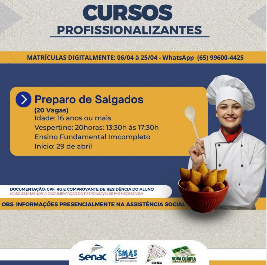 A Prefeitura Municipal de Nova Olímpia, em uma ação conjunta entre as Secretarias de Assistência Social e Educação e o SENAC, anuncia a abertura de inscrições para o curso profissionalizante de Preparo de Salgados. A iniciativa visa capacitar cidadãos para o mercado de trabalho e fomentar o empreendedorismo local. As matrículas devem ser realizadas de forma digital entre os dias 6 e 25 de abril, exclusivamente através do WhatsApp (65) 99600-4425. Para os interessados que buscam orientações detalhadas, o suporte presencial está disponível na sede da Assistência Social do município.