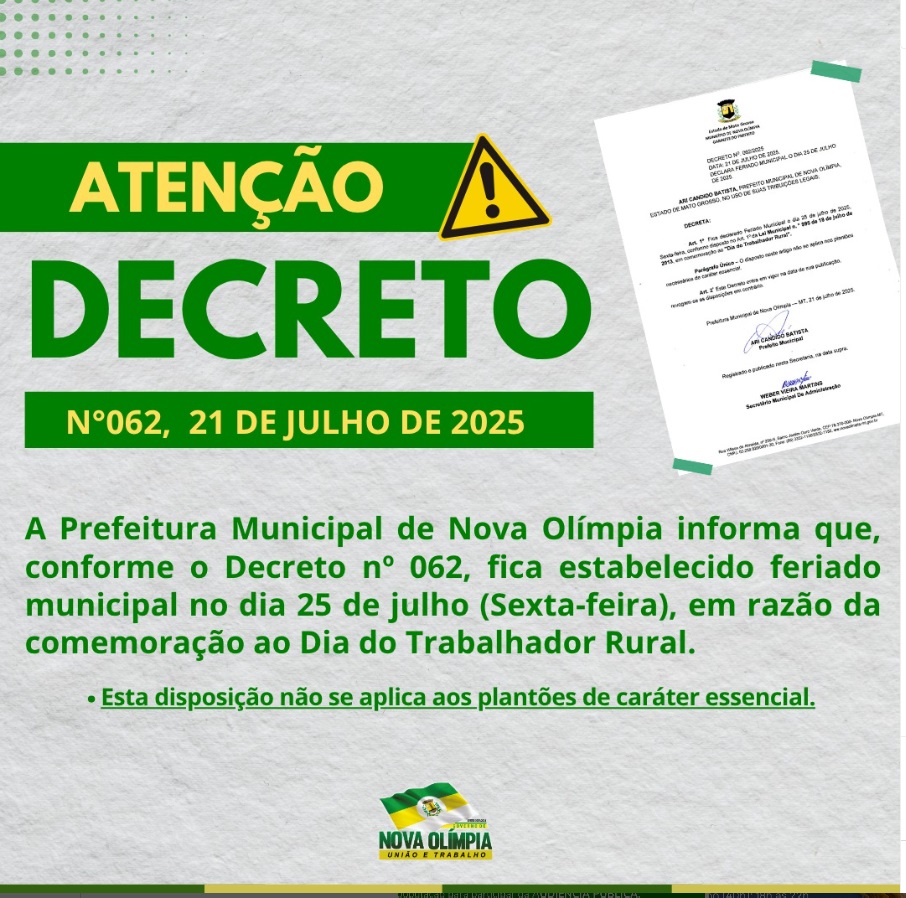 A Prefeitura Municipal de Nova Olímpia anunciou, por meio do Decreto nº 062, que o dia 25 de julho, próxima sexta-feira, será feriado municipal em virtude da celebração ao Dia do Trabalhador Rural. A decisão visa reconhecer e valorizar a importância dos agricultores e trabalhadores e trabalhadoras rurais que contribuem significativamente para o desenvolvimento da cidade.