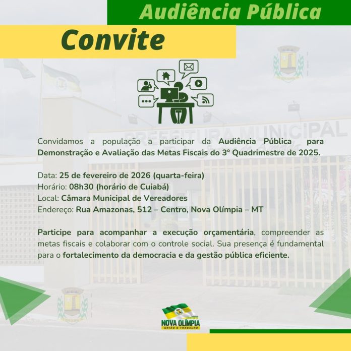 A transparência na gestão do dinheiro público volta à pauta principal em Nova Olímpia nesta quarta-feira, 25 de fevereiro. A Prefeitura Municipal promove, na Câmara de Vereadores, a audiência pública para a Demonstração e Avaliação das Metas Fiscais do 3º Quadrimestre de 2025.