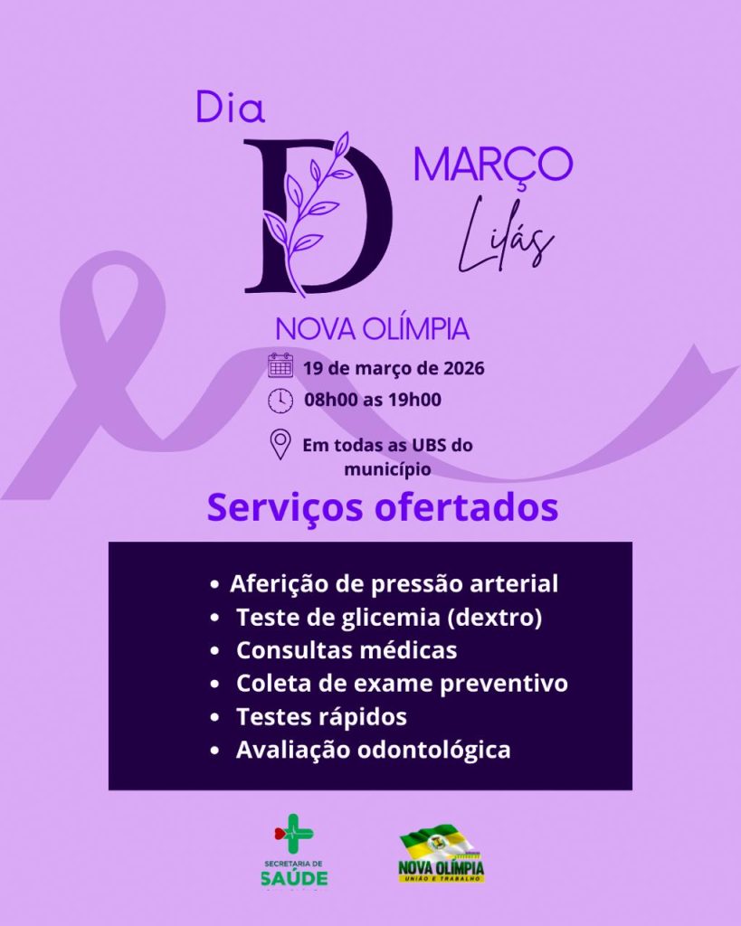 Em homenagem ao Mês da Mulher, Nova Olímpia se prepara para um dia dedicado ao bem-estar das mulheres do município. A Prefeitura, por meio da Secretaria Municipal de Saúde, convida todas as mulheres a participarem do Dia D da Saúde da Mulher, que será realizado na próxima quinta-feira, 19 de março, das 8h às 19h.
