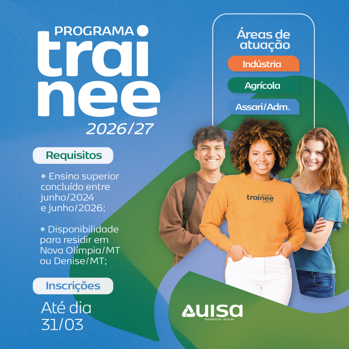 As inscrições são totalmente gratuitas e devem ser realizadas de forma online, por meio do site oficial (https://nossagente.uisa.com.br/carreiras). O programa acontece de forma presencial, sendo requisito que os candidatos tenham disponibilidade para residir nos municípios de Nova Olímpia ou Denise (MT), com início previsto para junho de 2026.