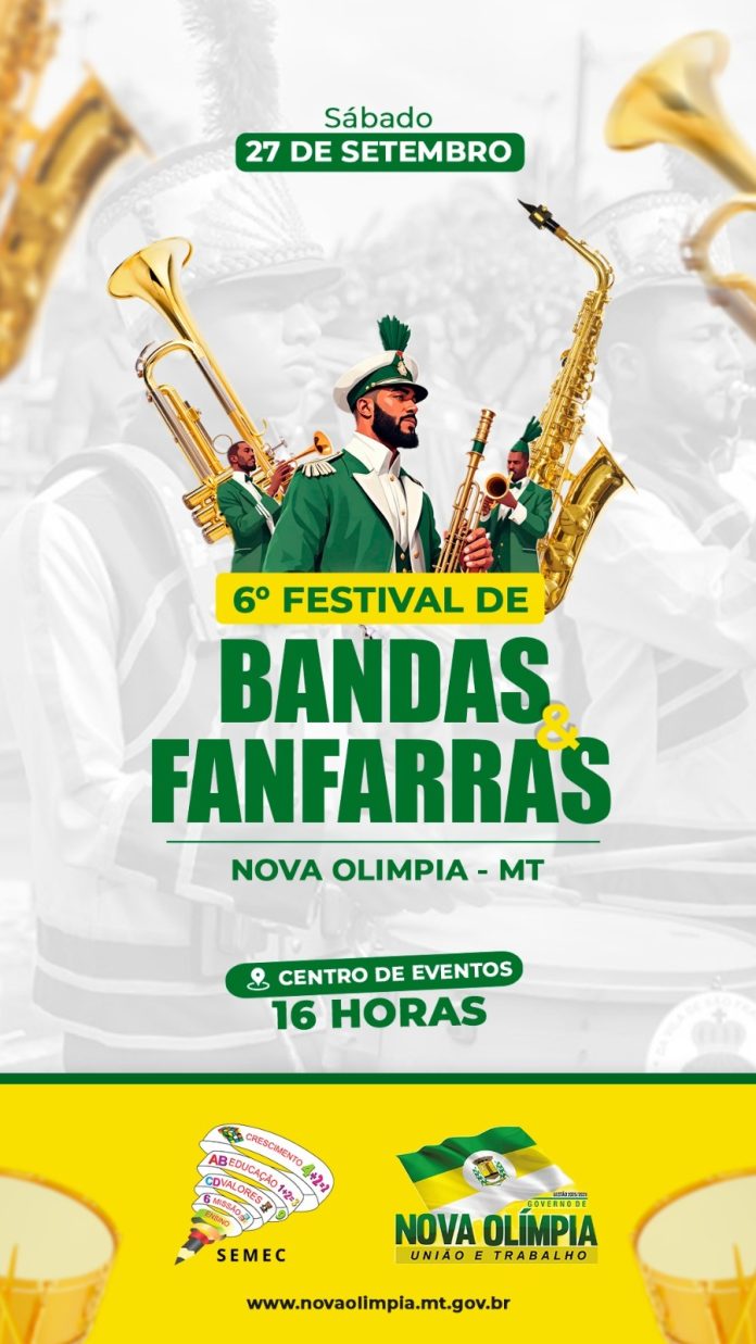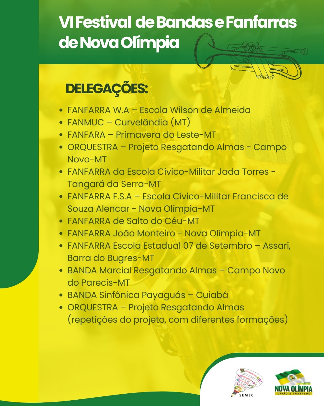 O VI Encontro de Bandas e Fanfarras promete reunir famílias, estudantes e amantes da música para uma tarde de espetáculo, ritmo e cultura, celebrando a música das bandas e fanfarras que abrilhantam as escolas e comunidades de Nova Olímpia e regiões vizinhas.